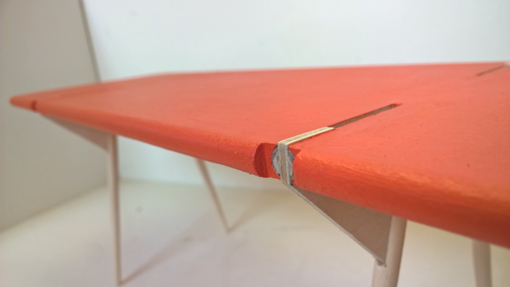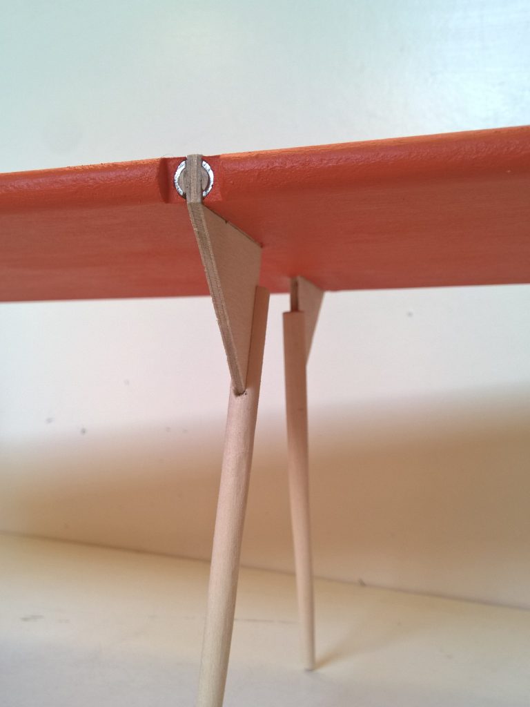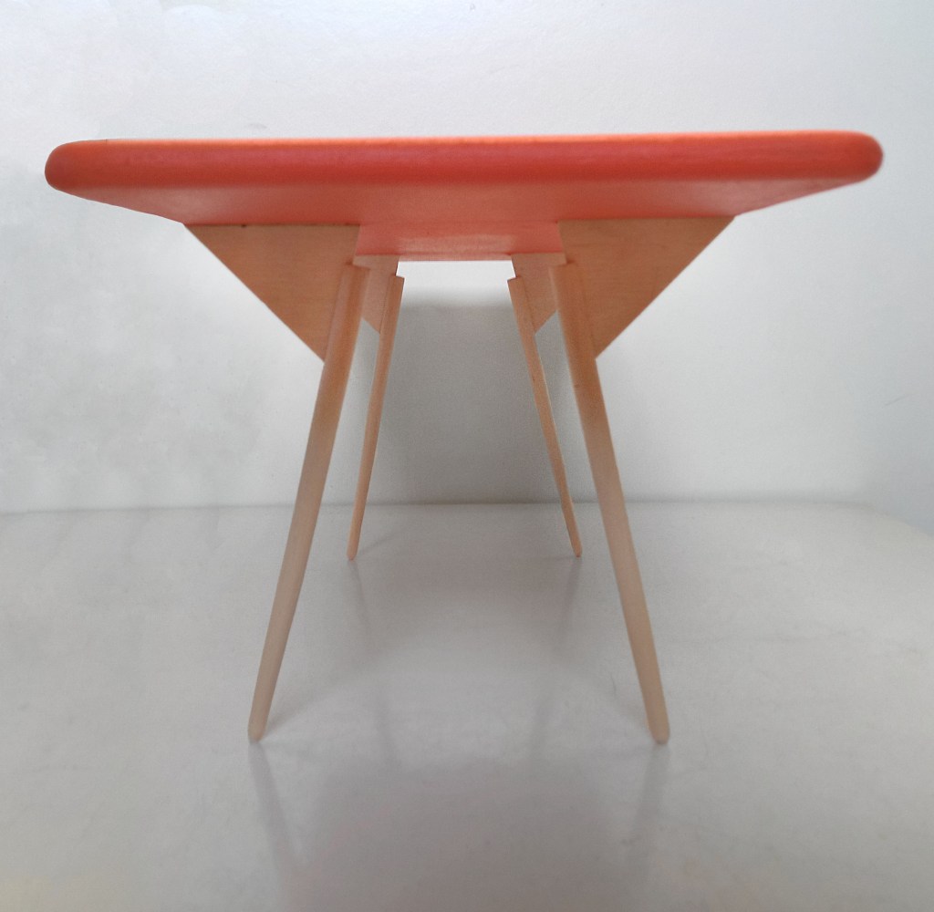 table in its elegant legs. The colors of the table show the three materials used: light brown beech, aluminum and an orange