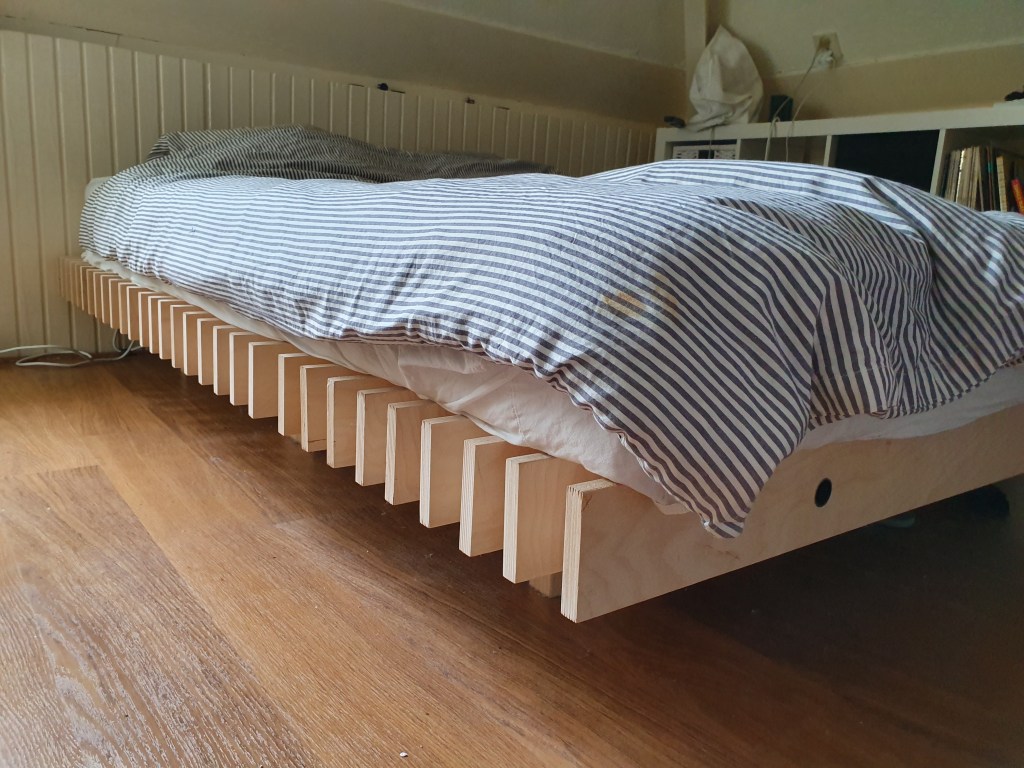 The bed is made by simply threading two tubes through the wooden beams, so screws are redundant. The legs, threaded as well, are placed inwards, creating a legless image. Rubber rings keep the beams at a set distance from eachother.