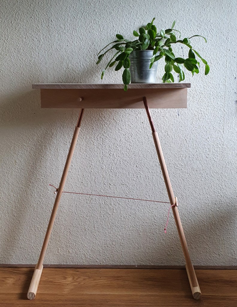 The Dressoir is made with only 8 screws. The top floats above the tripod legs, as the connecting beam is set back to the middle of the dressoir. At both sides, the top folds and hangs, allowing the lines of the multiplex to continue down.