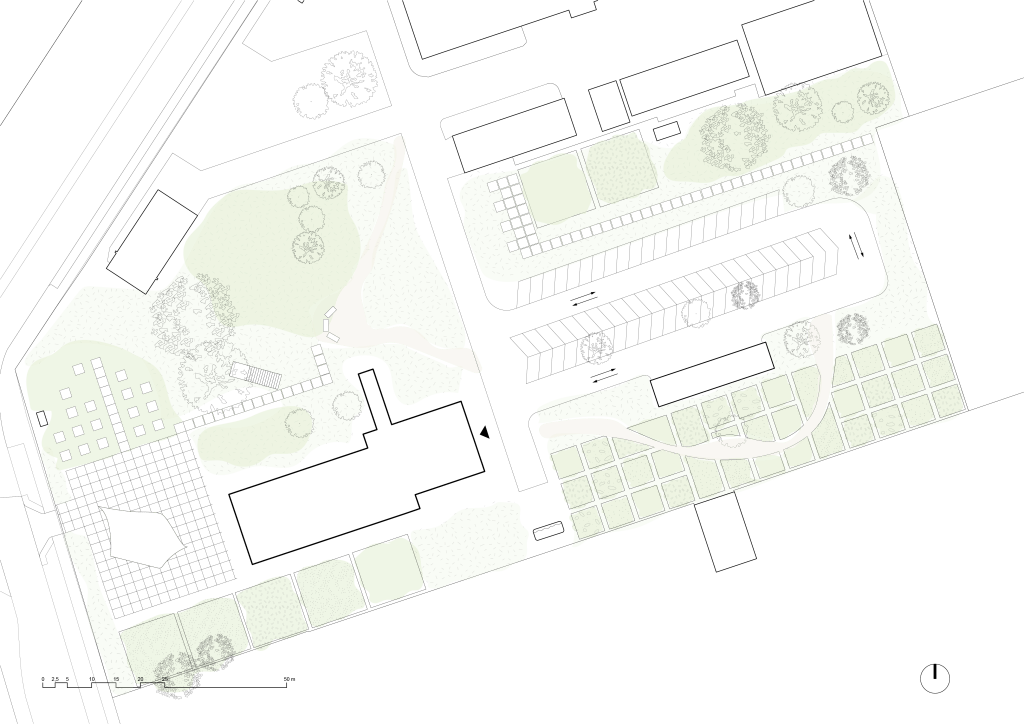 In collaboration with the municipality, we have developed a proposal to further develop the Gele keet as an oasis in the city. The big challenge is to add something without losing the casual, experimental and free character of the place. By means of minimal interventions, a design was created in which the building can serve as a place where schoolchildren can learn about soil, nature and sustainable urban management. Most interventions can be realized by using the materials that are already present on site. Part of the pavement of the vacant parking bays will be converted into ground bays. Residual wood is used together with the paving for a new shed, where children can work in and on. Already existing concrete slabs are used for the construction of paths and a small square for events. Other material is used for various art installations. With a small budget and short material chains, the Yellow Keet can reinforce its unique character: a place where experimentation and nature are given space.