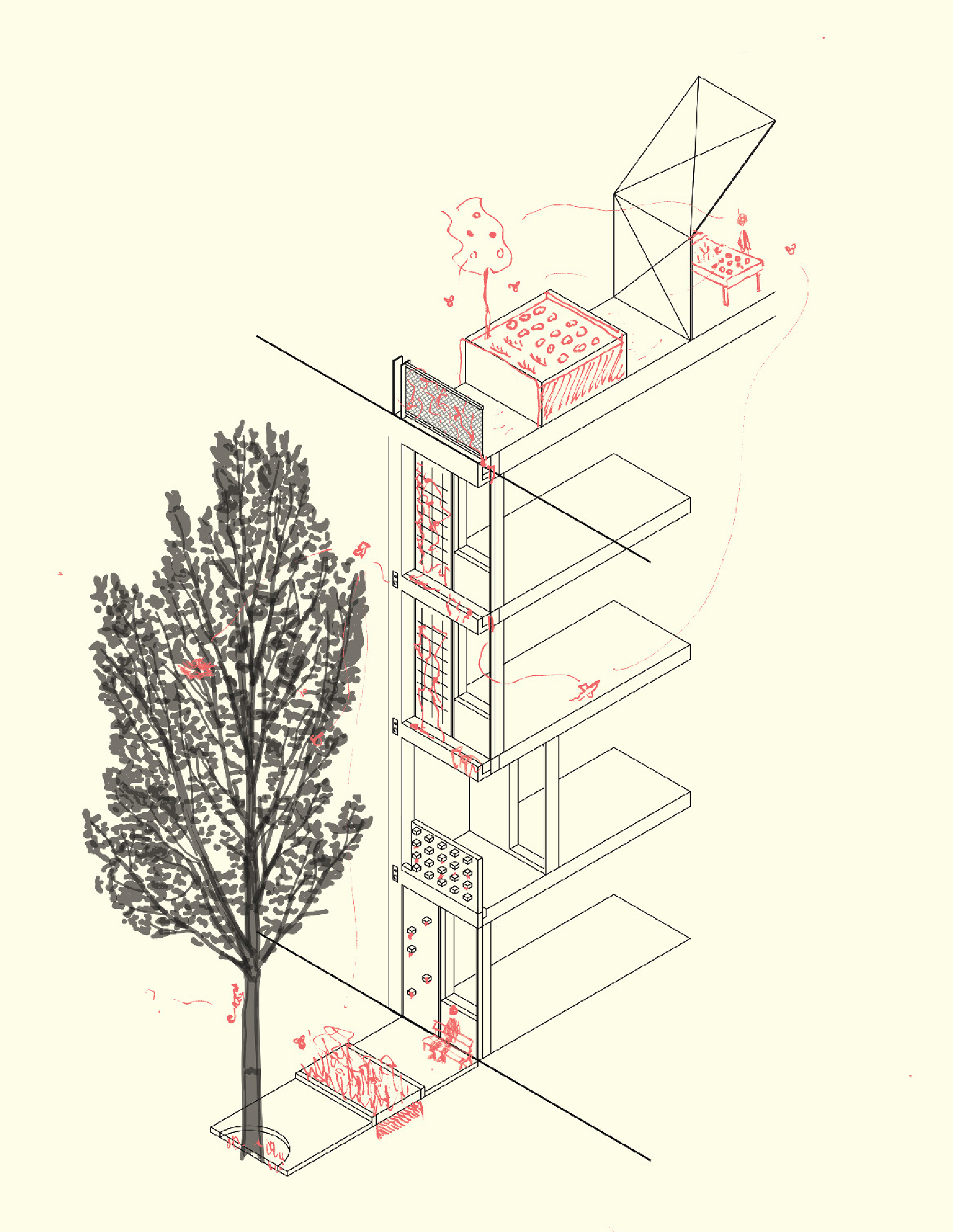 1 million new homes will have to be built in The Netherlands in the upcoming decades. This is largely due to the fact that an increasing amount of people is choosing to live alone. Solo dwellers can be divided into two categories: people who choose to live alone and people who are forced to do so. The former group thrives on the opportunities that the urban environment provides. The latter group, however, is generally more vulnerable to feelings of loneliness and social isolation. This project is an experiment on the role which urban nature can play in creating suitable urban environments for solo dwellers.